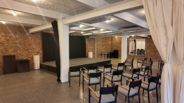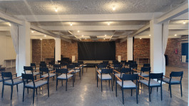 Raum ist mit einer mobilen Bühne ausgestattet, die aus vier Elementen besteht und eine Gesamtfläche von 16 m² bietet. Diese Bühne ist mit Effektbeleuchtung versehen, um eine besondere Atmosphäre zu schaffen. Für Präsentationen und Filme stehen zwei Leinwände zur Verfügung: Eine für Präsentationen im Format 1:1 (110“) und eine größere Leinwand im Format 16:9 (150“) für Filmvorführungen. Ein Beamer sorgt für die nötige Bildprojektion.